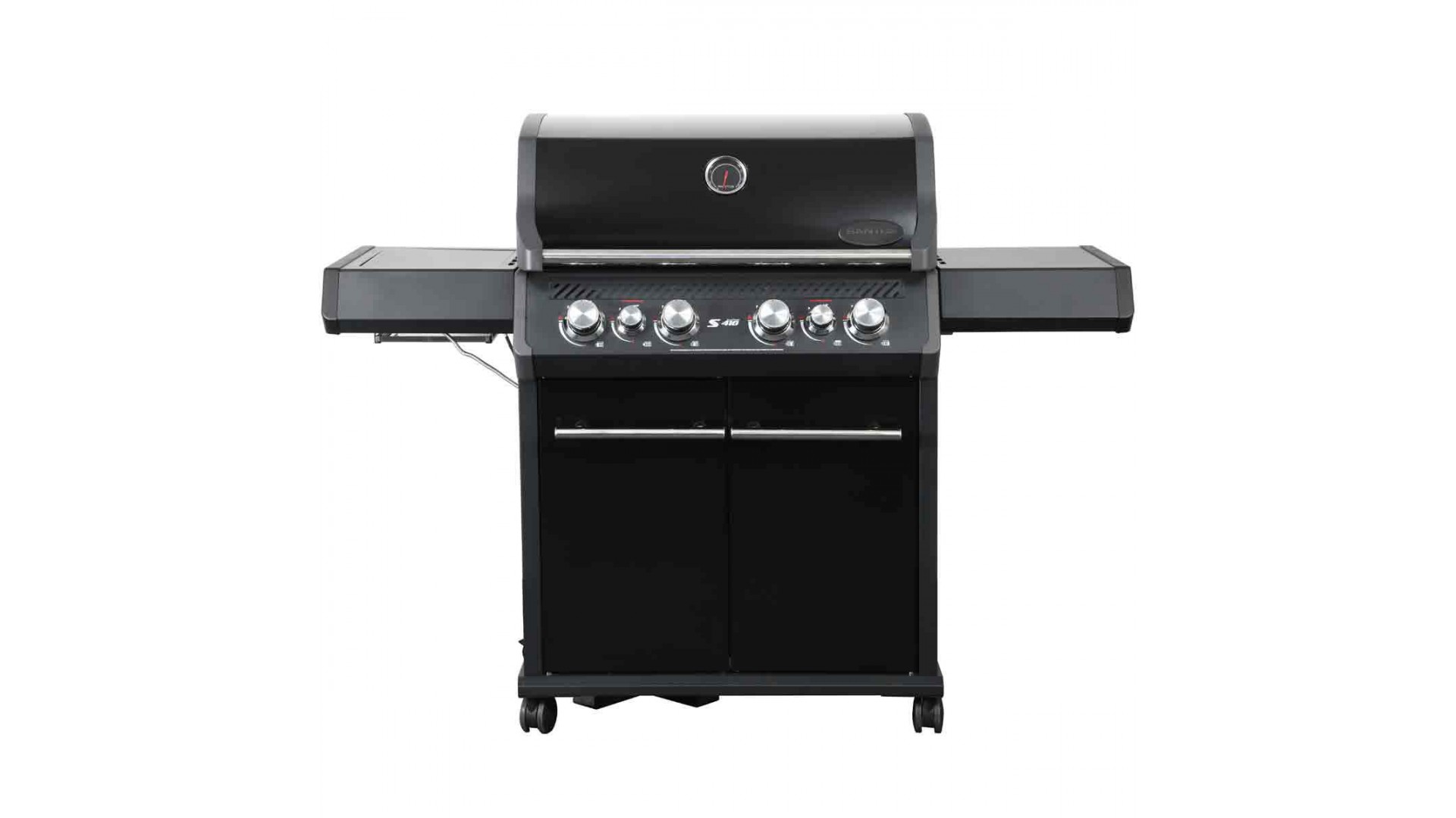 Santos S-418 All Black – газовый гриль на 4 основных горелки, выполненный полностью в черном матовом цвете. Имеет внушительных размеров рабочую поверхность для готовки (3200 кв.см) и богатую комплектацию, позволит одновременно приготовить на 8-12 человек. Гриль комплектуется керамической инфракрасной горелкой и задней горелкой под вертел, что расширяет кулинарные возможности – можно эффектно запечатывать стейки на боковой конфорке и готовить блюда на вертеле.