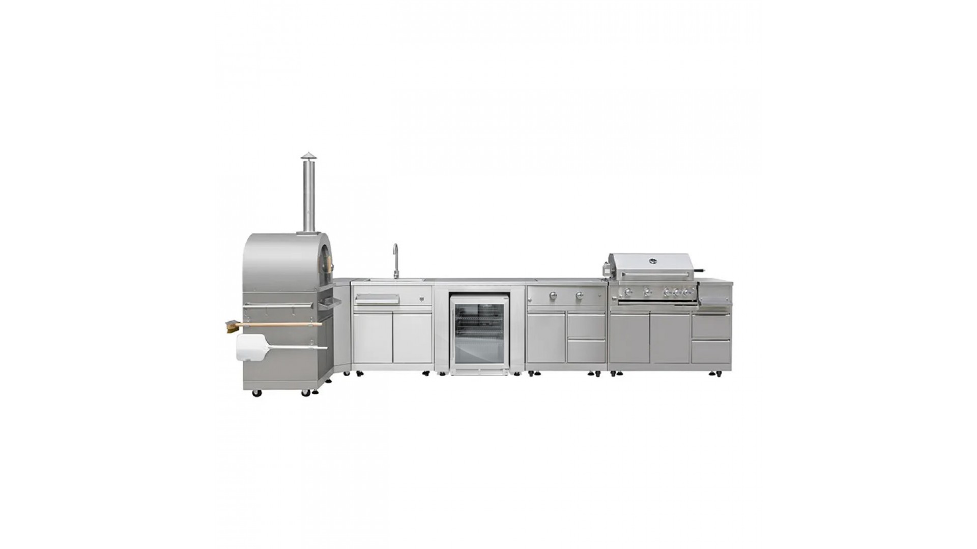 Создайте полноценное пространство с максимальными возможностями для приготовления блюд на свежем воздухе с уличной кухней-барбекю GRILLI 777603. Этот комплект объединяет в себе мощный газовый гриль, модуль с двойной газовой конфоркой, удобный модуль под встраиваемый гриль, практичный модуль с мойкой, газовую печь для пиццы, угловой модуль и модуль с холодильником для напитков – все выполнено из высококачественной нержавеющей стали SS304, которая отличается долговечностью, устойчивостью к коррозии и простотой ухода.